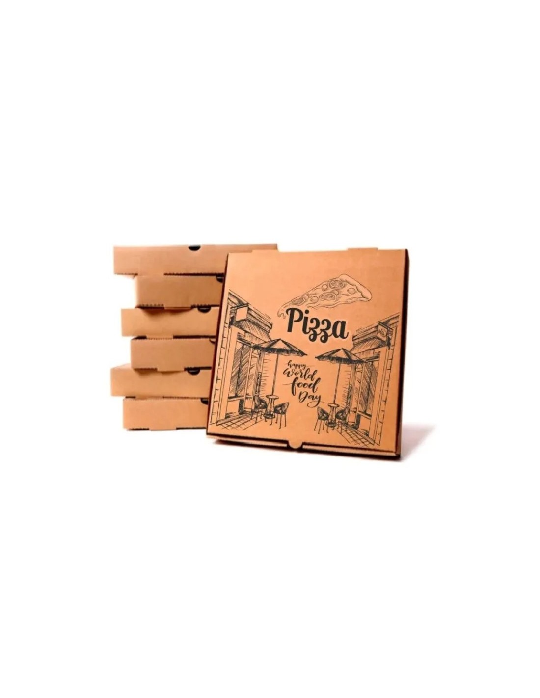 Setul conține 100 cutii pizza fabricate din carton Kraft rezistent, perfect adaptate pentru pizza cu diametrul de 28 cm. Cutia este robustă și eco-friendly, asigurând o bună protecție și menținerea prospețimii pizzei pe durata transportului sau servirii. Materialul natural kraft este reciclabil și biodegradabil, ideal pentru afaceri responsabile cu mediul.